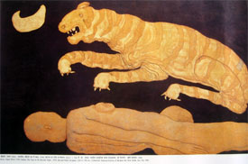 Always a powerful artist, Chowdhury developed his individual style after his return from France in the late '60s. Although Chowdhury has painted oils, his forte is painting in ink, water color and pastel. The sinuous line contouring the flaccid figures, the crosshatching to achieve tonal variations distinguish Chowdhury's paintings which show men and women m enigmatic situations with provocative gestures placed in a dark dream- space. There is a bit of the theatre of the absurd.